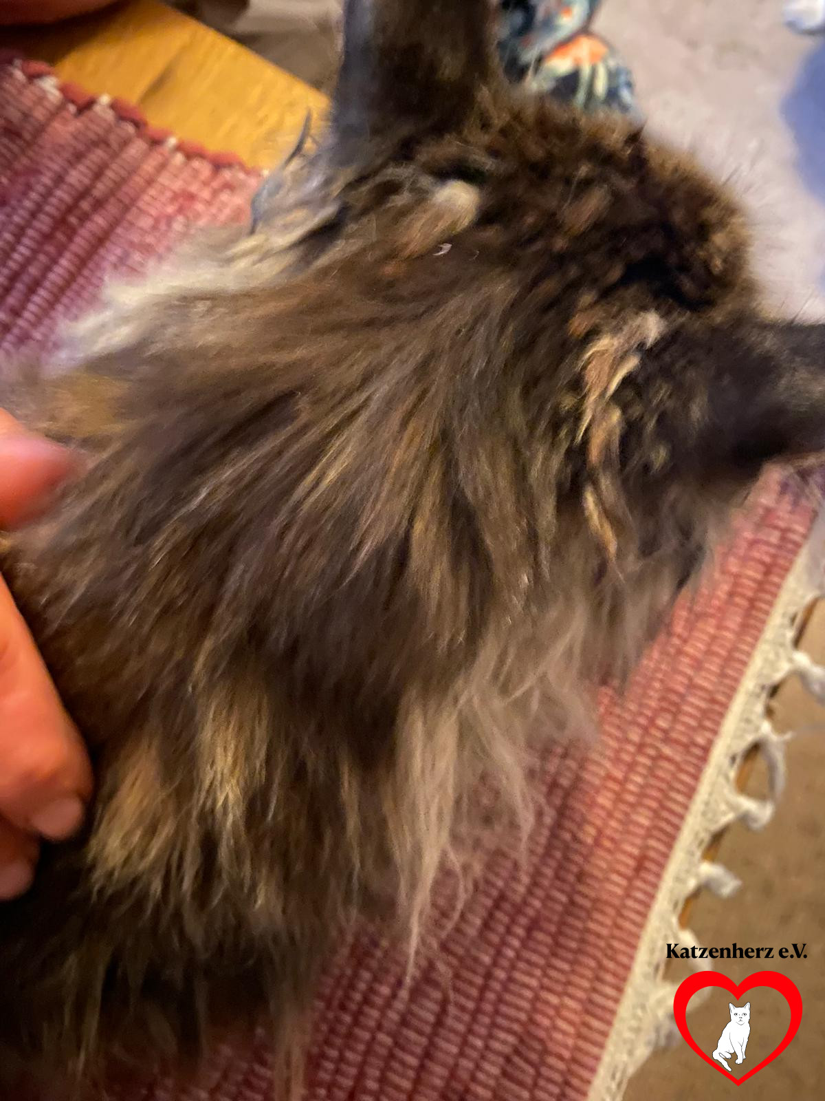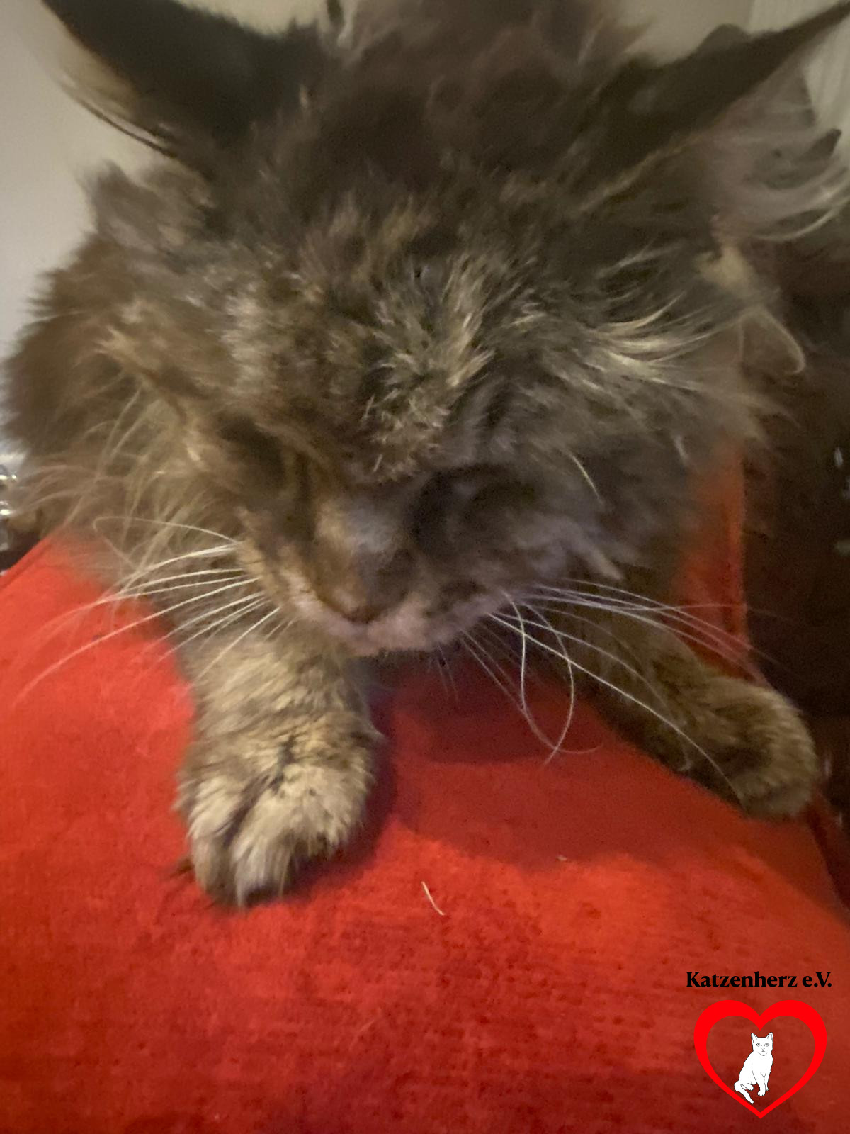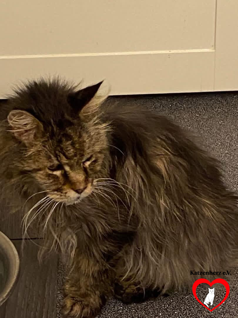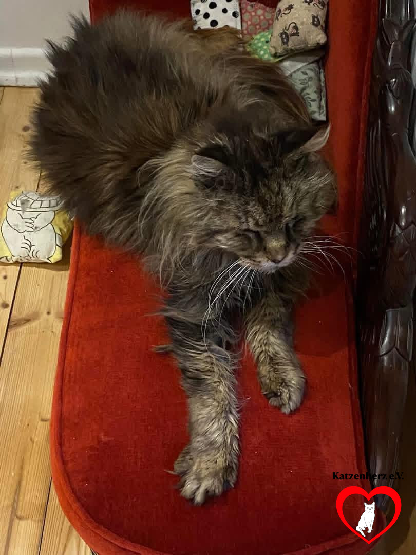Im Juli 2023 wurde er zu uns gebracht. Mindestens 15 Jahre alt, bis auf die Knochen abgemagert, nur noch drei Zähne, völlig verfilzt und schmutzig. Den Menschen, die ihn gerettet haben, lief er miauend hinterher. Als sie seinen Besitzer auf ihn ansprachen, wurden sie aggressiv vom Hof verwiesen. Der Kater solle Mäuse fangen und gehöre nicht ins Haus. 😪